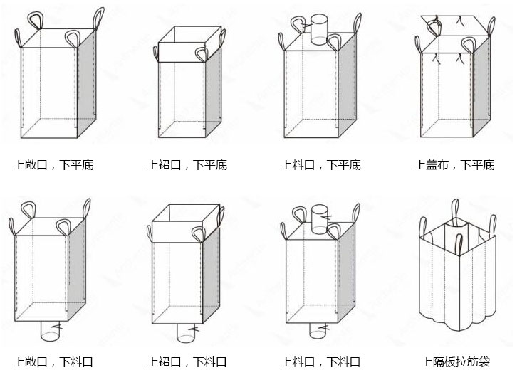 集裝袋的樣式多種多樣,可以根據(jù)客戶的實(shí)際要求來進(jìn)行定制,但是它的標(biāo)準(zhǔn)樣式一般有以下幾種,下面給大家初略講解下。